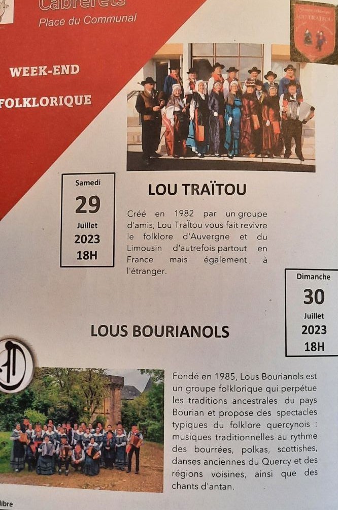 Rendez-vous CABRERETDimanche 30 juillet 2023 Description Spectacle a 15 h avec le groupe folklorique "LOUS BOURIANOLS" Les photos